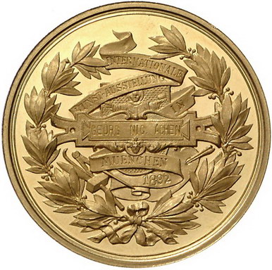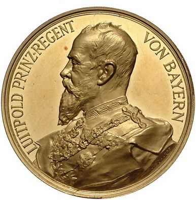 Los-Nummer: Auktion 51 - 143 Altdeutsche Münzen und Medaillen Bayern Prinzregent Luitpold 1886-1913, Goldmedaille zu 15 Dukaten 1892, von Scharff. Prämie der Kunstausstellung, verliehen an Georg Nic. Achen. Brustbild in Uniform mit umgelegtem Ordensband nach links / Zwischen Lorbeerzweigen Münchner Kindl mit Schriftband. Hauser 709, Wittelsbach 3053. 39,5 mm, 51,36 g. GOLD. Prachtexemplar. Polierte Platte Schätzpreis: 1750,- Zuschlag: 2000,- |