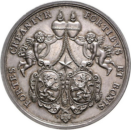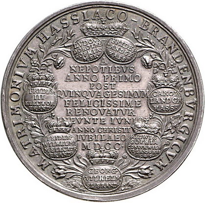 Los-Nummer: Auktion 51 - 389 Altdeutsche Münzen und Medaillen Brandenburg-Preußen Friedrich III. 1688-1701, Medaille 1700, von Christian Wermuth. Auf die Vermählung seiner Tochter Luise Dorothea Sophie mit Friedrich I. von Hessen-Kassel. Cupidines halten zwei Kartuschenschilde mit dem hessischen und dem Jülicher Löwen / Elf Zeilen Schrift zwischen Stammbaum aus Lilien und Rosen. Brockmann 506 , Menadier 257, Hoffmeister 1903, Wohlfahrt 00 020. 43 mm, 29,01 g. Schöne Patina. Fast Stempelglanz Schätzpreis: 1000,- Zuschlag: 1300,- |