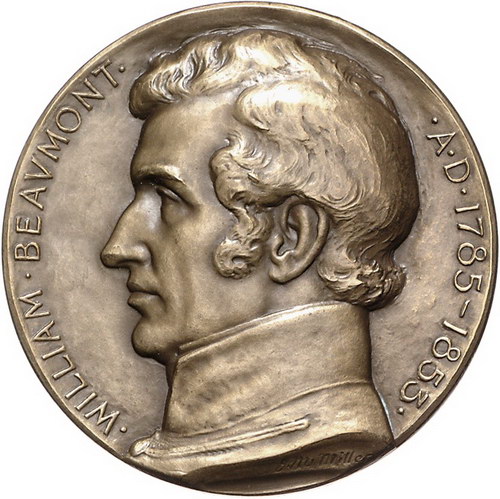 Los-Nummer: Auktion 51 - 2330 Medaillen Medicina in nummis Personenmedaillen Beaumont, William *1785, +1855, Bronzegussmedaille 1929, von Miller. Auf den 13. internationalen physiologischen Kongress in Boston. Büste nach links / Zwei unbekleidete Männer auf Globus halten Fackel. 51 mm. Mattiert. Vorzüglich Schätzpreis: 90,- Zuschlag: unverkauft |