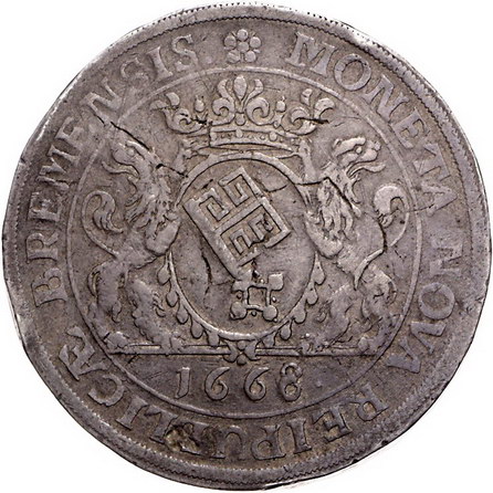 Los-Nummer: Auktion 51 - 701 Altdeutsche Münzen und Medaillen Bremen, Stadt Dicker vierfacher Taler 1668. Jahreszahl im Stempel geändert aus 1666. Münzmeister Thomas Isenbein. Mit Namen und Titel Leopolds. Von zwei Löwen gehaltener, gekrönter ovaler Wappenschild mit Bremer Schlüssel, im Abschnitt die Jahreszahl / Gekrönter Doppeladler mit Reichsapfel auf der Brust. Jungk 506, Davenport 5108 , Slg. Danziger 443. Von größter Seltenheit. Kl. Schrötlingsfehler, sehr schön / fast sehr schön Schätzpreis: 20000,- Zuschlag: 17000,- |