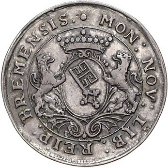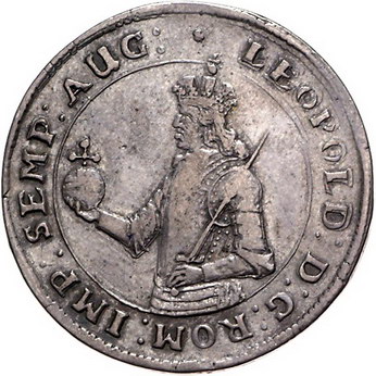 Los-Nummer: Auktion 51 - 700 Altdeutsche Münzen und Medaillen Bremen, Stadt 1/2 Taler o.J. Hüftbild des gekrönten Kaisers Leopold nach links mit Reichsapfel in der Rechten und Zepter in der Linken / Von zwei Löwen gehaltener, gekrönter ovaler Wappenschild mit Bremer Schlüssel. Jungk 525 , Slg. Danziger 465. Von größter Seltenheit. Sehr schön Schätzpreis: 2000,- Zuschlag: 3800,- |