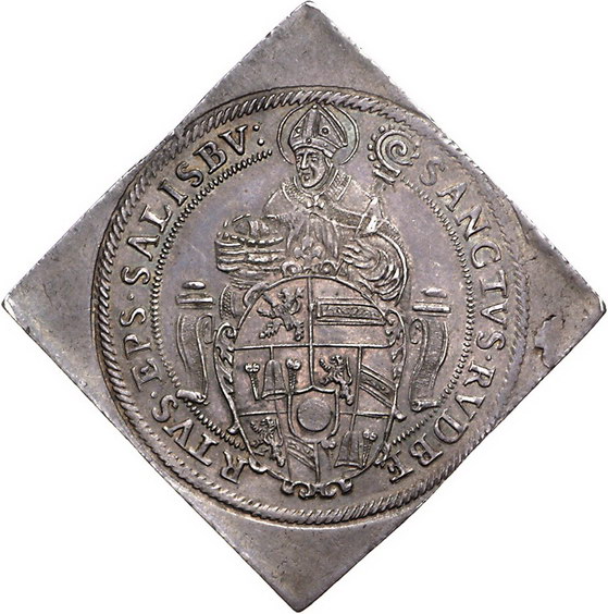Los-Nummer: Auktion 51 - 2230 Haus Habsburg Salzburg, Erzbistum Wolf Dietrich von Raitenau 1587-1612, Turmtalerklippe 1593. Probszt 805, Davenport 8200. Herrliche Patina. Vorzüglich + Schätzpreis: 750,- Zuschlag: 1000,- |