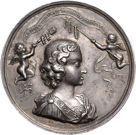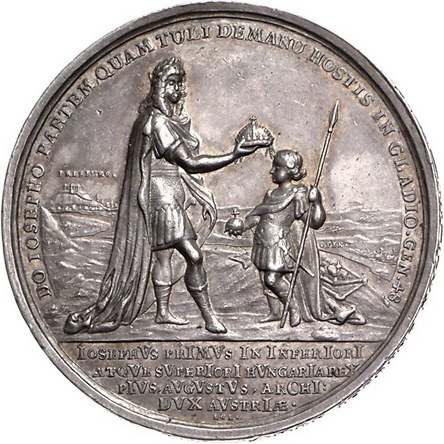 Los-Nummer: Auktion 51 - 2135 Haus Habsburg Haus Habsburg Josef I. 1705-1711, Medaille 1687, von Hautsch. Auf seine Krönung zum König von Ungarn. Jugendliches Brustbild nach rechts zwischen zwei Genien / Leopold gibt seinem Sohn die Stephanskrone. Slg. Montenuovo 1196. 45,5 mm, 39,80 g. Winz. Randfehler, fast vorzüglich Schätzpreis: 300,- Zuschlag: 370,- |