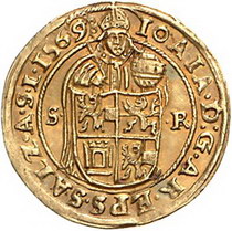 Los-Nummer: Auktion 51 - 2228 Haus Habsburg Salzburg, Erzbistum Johann Jakob Khuen von Belasi 1560-1586, Dukat 1569 mit Namen Maximilian. St. Rupertus hinter vierteiligem Wappen / Gekrönter Doppeladler. Probszt 500, Friedberg 637. GOLD. Sehr selten. Leicht gewellt, vorzüglich Schätzpreis: 750,- Zuschlag: 1200,- |