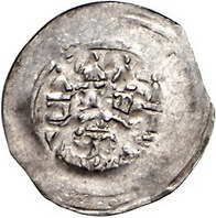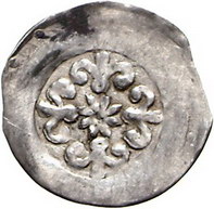 Los-Nummer: Auktion 51 - 4054 Ausländische Münzen und Medaillen Tschechien-Eger (Cheb), Reichsmünzstätte Friedrich II. 1212-1250, Dünnpfennig. 0,64 g. Lilienkreuz in Wulstreif, in der Mitte achtblättrige Rosette / Mitrierter Kopf im Torbogen einer viertürmigen Kirche. Hásková 41 , Krug 66 (Bamberg). Beidseitig gut ausgeprägt. Sehr schön - vorzüglich Schätzpreis: 100,- Zuschlag: 130,- |
