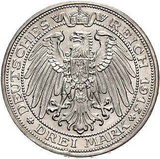 Los-Nummer: Auktion 51 - 2656 Münzen des Deutschen Kaiserreichs Preußen Wilhelm II. 1888-1918, 3 Mark 1915 A. Mansfeld. Jaeger 115. Vorzüglich - Stempelglanz Schätzpreis: 600,- Zuschlag: 510,- |