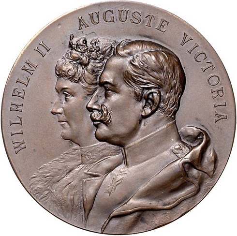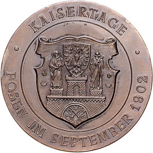 Los-Nummer: Auktion 51 - 3647 Ausländische Münzen und Medaillen Polen-Posen, Stadt Bronzemedaille 1902. Auf die Kaisertage in Posen, im Auftrag der numismatischen Gesellschaft in Posen. Die Brustbilder des Kaiserpaares nebeneinander nach links / Stadtwappen. 50 mm. Mattiert. Prägefrisch Schätzpreis: 75,- Zuschlag: 60,- |