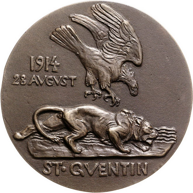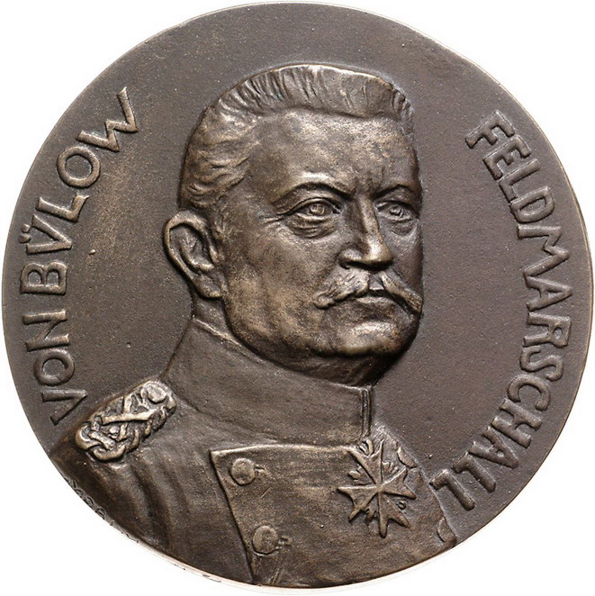 Los-Nummer: Auktion 51 - 2531 Medaillen Erster Weltkrieg Personenmedaillen Bülow, Bernhard Heinrich Martin Fürst von *1849 Klein Flottbeck/Hamburg, +1929 Rom, Bronzegussmedaille o.J. (1914), von Morin. Brustbild halbrechts / Adler greift einen Löwen im Sturzflug. Zetzmann 4023 (Ag). 96 mm. Vorzüglich Schätzpreis: 100,- Zuschlag: 100,- |
