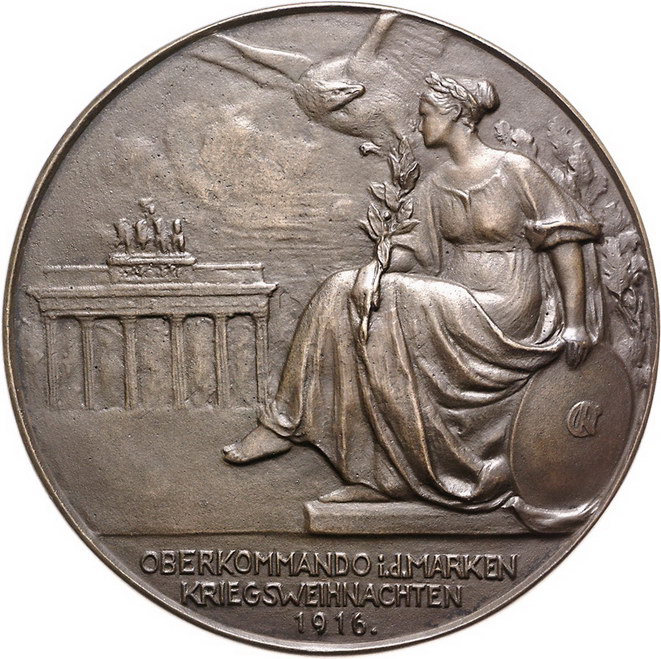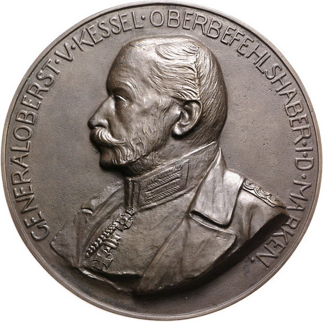 Los-Nummer: Auktion 51 - 2539 Medaillen Erster Weltkrieg Personenmedaillen Kessel, Generaloberst Gustav von *1846 Potsdam, +1918 Berlin, Bronzegussmedaille 1916, von Becher. Brustbild nach links / Friedensgenie, auf die ein Adler zufliegt, im Hintergrund Brandenburger Tor. 114 mm. Sehr schön Schätzpreis: 125,- Zuschlag: 100,- |