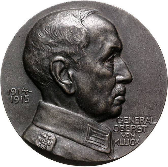 Los-Nummer: Auktion 51 - 2540 Medaillen Erster Weltkrieg Personenmedaillen Kluck, Generaloberst Alexander von, Eisengussmedaille o.J. (1915), von Löwenthal. Brustbild nach rechts / Adler auf Mauerzinne vor Stadtansicht Paris. 88 mm. Vorzüglich Schätzpreis: 100,- Zuschlag: 160,- |