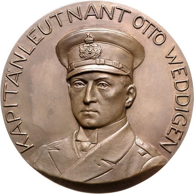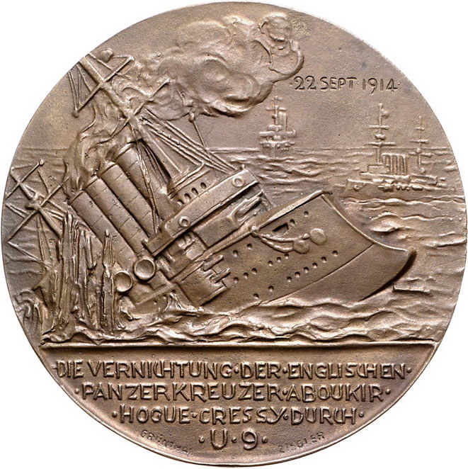 Los-Nummer: Auktion 51 - 2548 Medaillen Erster Weltkrieg Personenmedaillen Weddigen, Otto *1882 Herford, +1925, Bronzegussmedaille 1914, von Grünthal und Ziegler. Auf die Versenkung englischer Panzerkreuzer. Brustbild halblinks / Sinkendes Kriegsschiff. Zetzmann 4003 (Ag). 107 mm. Vorzüglich Schätzpreis: 125,- Zuschlag: 170,- |