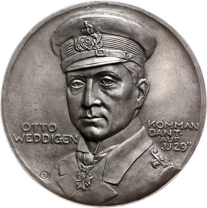 Los-Nummer: Auktion 51 - 2549 Medaillen Erster Weltkrieg Personenmedaillen Weddigen, Otto *1882 Herford, +1925, Eisengussmedaille o.J. (1916), von Löwenthal. Brustbild in Uniform halblinks / Sinkendes Kriegsschiff. 114 mm. Vorzüglich Schätzpreis: 125,- Zuschlag: 190,- |