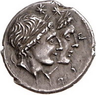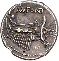 Los-Nummer: Auktion 51 - 5 Römische Münzen Republik Mn. Fonteius 108-107 v. Chr. Denar, Rom. 3,03 g. Belorbeerte Köpfe der Dioskuren mit je einem Stern nach rechts, rechts unten Wertzeichen und PP / Galeere mit Doliolum im Heck nach rechts, darüber MN FONTEI, unten Buchstabe. Sydenham 566 b, Crawford 307/1 a. Suberat. Vorzüglich Schätzpreis: 150,- Zuschlag: 325,- |