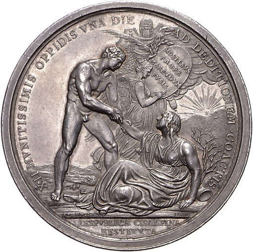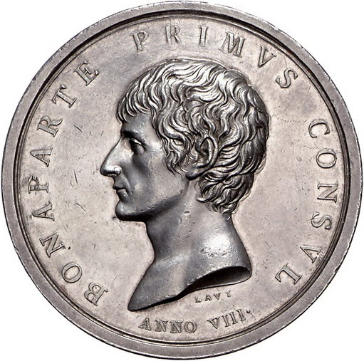 Los-Nummer: Auktion 51 - 3016 Ausländische Münzen und Medaillen Frankreich Medaillen Napoleons I. Medaille AN VIII (1800), von Lavy. Auf die Schlacht bei Marengo. Brustbild nach links / Herkules hilft dem am Boden liegenden personifizierten Italien, im Hintergrund schreibt Viktoria auf Tafel. Slg. Julius 802, Bramsen 42. 53 mm, 73,23 g. Schöne Patina. Vorzüglich Schätzpreis: 400,- Zuschlag: 410,- |