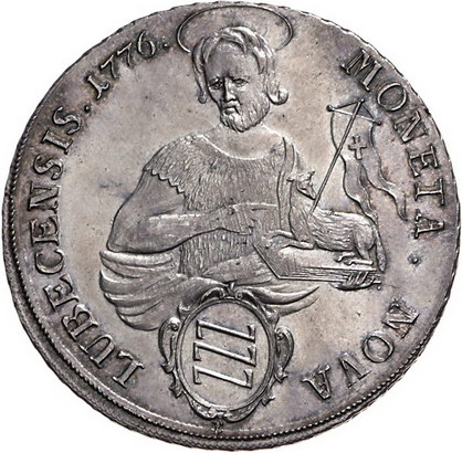 Los-Nummer: Auktion 51 - 1013 Altdeutsche Münzen und Medaillen Lübeck, Stadt Taler 1776. Hüftbild des Heiligen Johannes mit Buch, Lamm und Fahne leicht nach links gewandt, darunter ovales Wappen des Bürgermeisters Daniel Haecks / Gekrönter Doppeladler, darunter Münzmeisterinitialen. Behrens 197 b, Davenport 2422, Jaeger 37. Schöne Patina. Vorzüglich Schätzpreis: 500,- Zuschlag: 560,- |