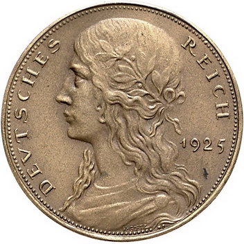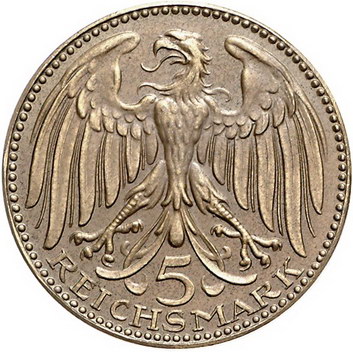 Los-Nummer: Auktion 51 - 2757 Proben Weimarer Republik Bronze 5 Mark 1925 D. Schaaf 331 G2 1-2, Kienast 352. 20,91 g. Mattiert. Vorzüglich Schätzpreis: 250,- Zuschlag: unverkauft |