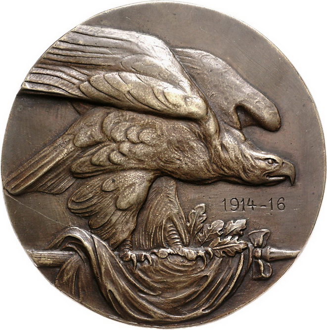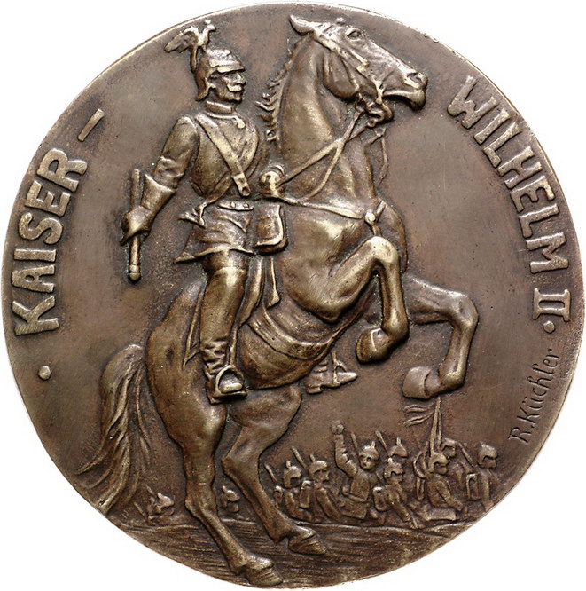 Los-Nummer: Auktion 51 - 2523 Medaillen Erster Weltkrieg Große Bronzegussmedaille 1916, von Küchler. Nach rechts reitender Kaiser, im Hintergrund marschierende Truppen / Adler auf Schwert mit Tuch und Eichenlaub. 98 mm. Vorzüglich Schätzpreis: 150,- Zuschlag: 120,- |