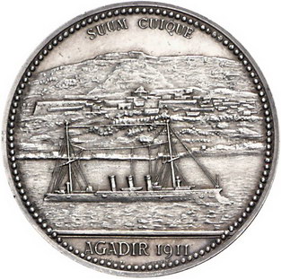 Los-Nummer: Auktion 51 - 2490 Medaillen Kolonien Medaille 1911. Auf die Entsendung des Kanonenboots 'Panther' während der zweiten Marokkokrise. Brustbild des Staatssekretärs des Äußeren von Kiderlen-Wächter halbrechts / Ansicht des Kanonenboots vor Agadir. 32 mm, 18,19 g. Vorzüglich Schätzpreis: 125,- Zuschlag: 160,- |