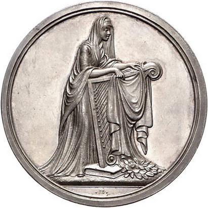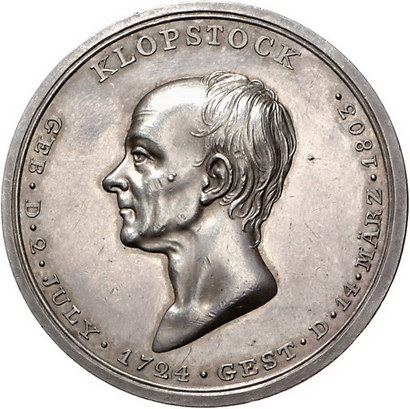Los-Nummer: Auktion 51 - 2457 Medaillen Personenmedaillen Klopstock, Friedrich Gottlieb *2.7.1724 Quedlinburg, +14.3.1803 Hamburg, Medaille 1803, von Bauert. Auf seinen Tod. Büste nach links / Trauernde Muse mit verhüllter Harfe. Lange 1048. 42 mm, 29,12 g. Winz. Kratzer, vorzüglich + Schätzpreis: 175,- Zuschlag: 190,- |