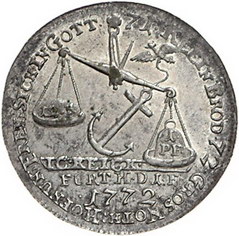 Los-Nummer: Auktion 51 - 187 Altdeutsche Münzen und Medaillen Brandenburg-Medaillen von Johann Christian Reich Versilberter Kupferjeton#0Medaille# 1772. Auf die Teuerung und Hungersnot in Franken. Waage mit 12 K(reuzer), Pfundgewicht und Anker / Schrift. Slg. Brettauer - vergl. 1937. 24,5 mm. Vorzüglich - Stempelglanz Schätzpreis: 100,- Zuschlag: 100,- |