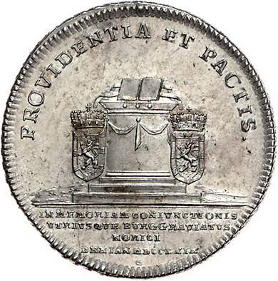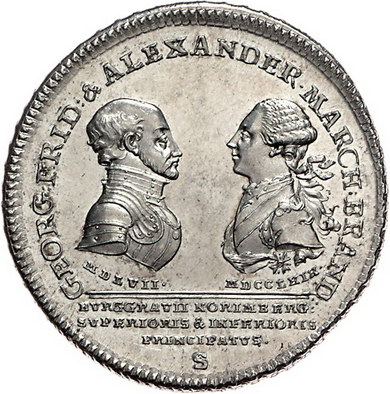 Los-Nummer: Auktion 51 - 177 Altdeutsche Münzen und Medaillen Brandenburg-Ansbach Alexander 1757-1791, Taler 1769 S, Schwabach. Auf die Vereinigung der beiden Fürstentümer. Die Brustbilder Georg Friedrichs und Alexanders einander gegenüber / Altar mit aufgeschlagenem Buch, zu den Seiten die Wappen der beiden Linien. Slg. Wilmersdörffer 1086, Davenport 1999. Prachtexemplar. Fast Stempelglanz Schätzpreis: 750,- Zuschlag: 825,- |