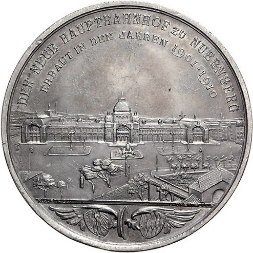 Los-Nummer: Auktion 51 - 2404 Medaillen Münchner Medailleure Goetz, Karl Zinnmedaille 1911. Auf den 90. Geburtstag des Prinzregenten Luitpold und die Eröffnung des neuen Hauptbahnhofs in Nürnberg. Brustbild halblinks / Ansicht des Bahnhofs mit Vorplatz. Kienast 660, Erlanger 792, Slg. Erlanger 1488. 51 mm. Winz. Randfehler, vorzüglich Schätzpreis: 100,- Zuschlag: 95,- |