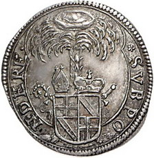 Los-Nummer: Auktion 51 - 828 Altdeutsche Münzen und Medaillen Fulda, Bistum Bernhard Gustav von Baden-Durlach 1671-1677, 1/8 Taler 1672. Vierfeldiges Wappen unter Kardinalshut vor Palme / Schrift. Gerling/Erdmann 75/1, Buchonia 4. 3,11 g. Vorzüglich Schätzpreis: 500,- Zuschlag: 460,- |