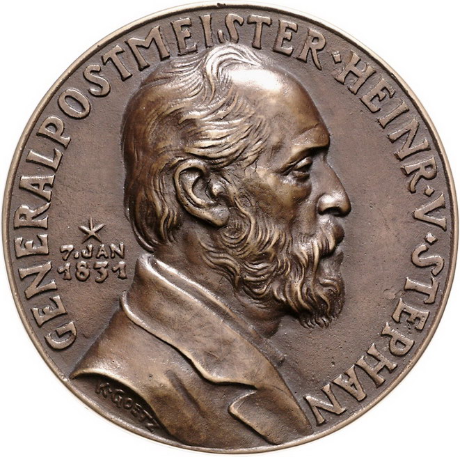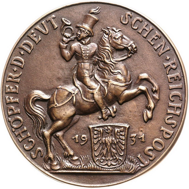 Los-Nummer: Auktion 51 - 2395 Medaillen Münchner Medailleure Goetz, Karl Große Bronzegussmedaille 1931. Auf den Generalpostmeister Heinrich v. Stephan. Brustbild nach rechts / Reitender Postillon. Kienast 458. 96 mm. Vorzüglich Schätzpreis: 200,- Zuschlag: 250,- |