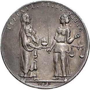 Los-Nummer: Auktion 51 - 924 Altdeutsche Münzen und Medaillen Hessen-Darmstadt Ernst Ludwig 1678-1739, Medaille 1699, von Roth. Brustbild nach rechts / Pietas und Justitia. Schütz 2826, Hoffmeister 3517. 32 mm, 11,58 g. Sehr schön Schätzpreis: 175,- Zuschlag: 280,- |