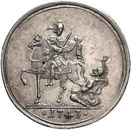 Los-Nummer: Auktion 51 - 1052 Altdeutsche Münzen und Medaillen Mainz, Erzbistum Sedisvakanz 1743, 1/4 Schautaler 1743, von W. Schäffer. St. Martin reitet nach links und teilt Mantel, rechts daneben der Bettler / Wappen. Slg. Walther 510, Prinz Alexander 669, Zepernick 20. 6,17 g. Vorzüglich + Schätzpreis: 400,- Zuschlag: 400,- |