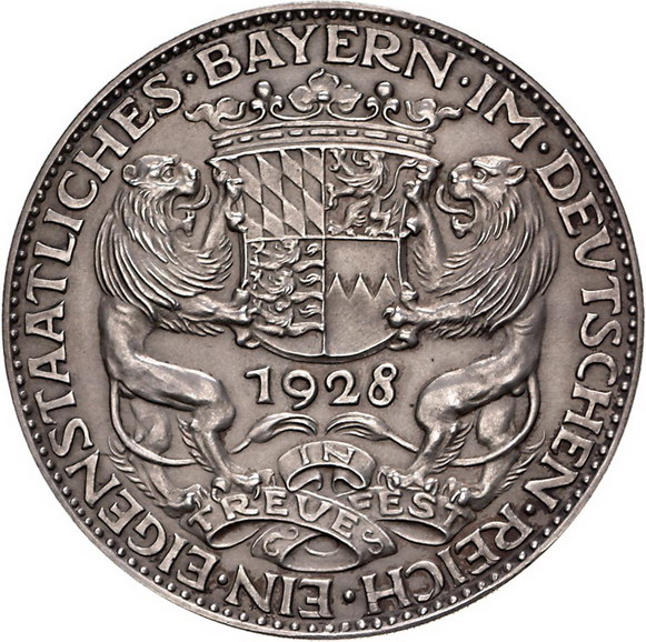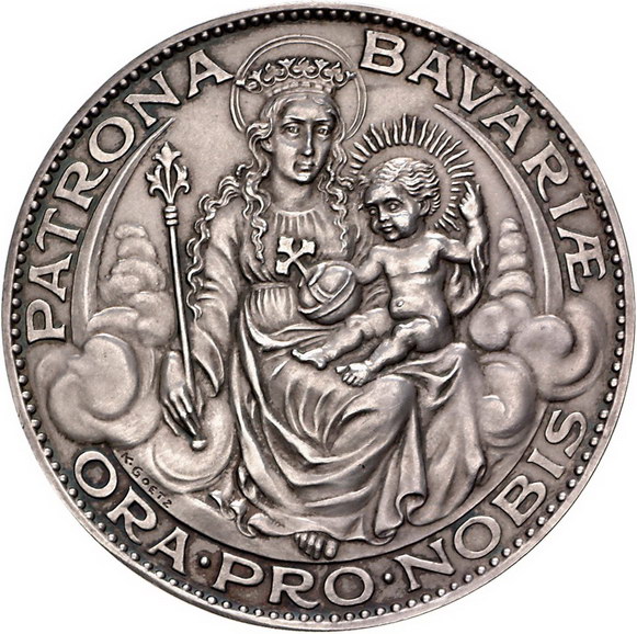 Los-Nummer: Auktion 51 - 2390 Medaillen Münchner Medailleure Goetz, Karl Medaille 1928. Auf die Eigenstaatlichkeit Bayerns im Deutschen Reich. Madonna mit Kind / Zwei Löwen halten bayerisches Wappen. Kienast 406. 60 mm, 43,99 g. Mattiert. Vorzüglich + Schätzpreis: 150,- Zuschlag: 220,- |