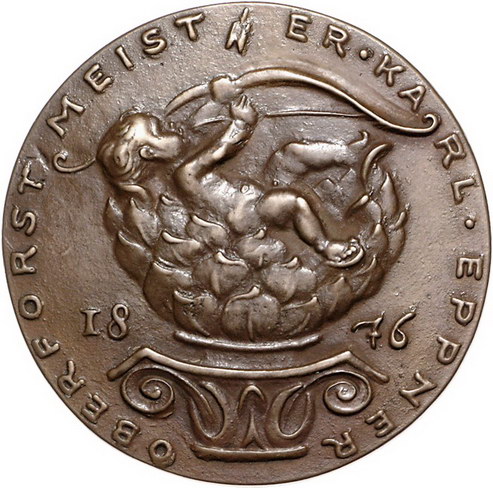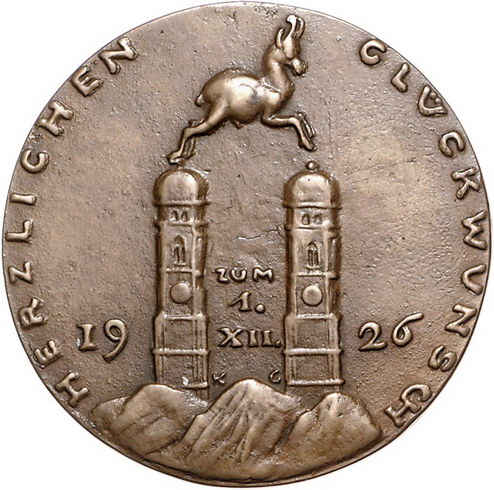 Los-Nummer: Auktion 51 - 2385 Medaillen Münchner Medailleure Goetz, Karl Bronzegussmedaille 1926. Auf den 50. Geburtstag des Oberforstmeisters Karl Eppner. Kind mit Bogen in Schale / Gamsbock über Münchner Frauenkirche. Kienast 366. 50,5 mm. Vorzüglich + Schätzpreis: 250,- Zuschlag: 215,- |