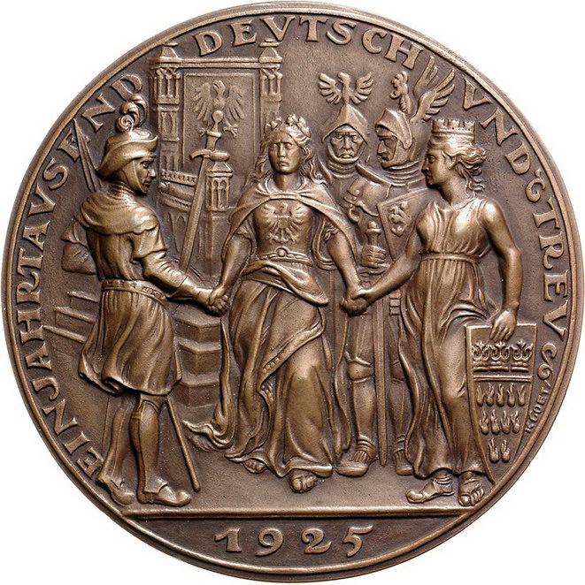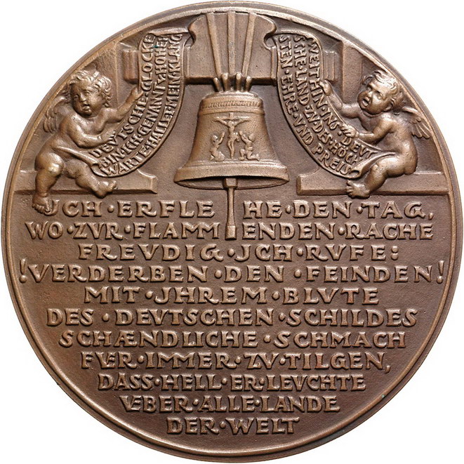 Los-Nummer: Auktion 51 - 2384 Medaillen Münchner Medailleure Goetz, Karl Große Bronzegussmedaille 1925. Auf die Jahrtausendfeier der Rheinlande. Ritter mit Germania und personifizierter Köln / Zwei Engel mit Glocke über Schrift. Kienast 324. 117 mm. Vorzüglich + Schätzpreis: 250,- Zuschlag: 340,- |