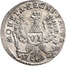 Los-Nummer: Auktion 51 - 3709 Ausländische Münzen und Medaillen Russland Elisabeth I. Petrowna 1741-1761, 6 Gröscher 1761, Königsberg. Russische Besetzung. Drei Haarlocken auf der Schulter. Diakov 724-726 , Olding 454 a. Prachtexemplar. Prägeschwäche, vorzüglich + Schätzpreis: 400,- Zuschlag: unverkauft |