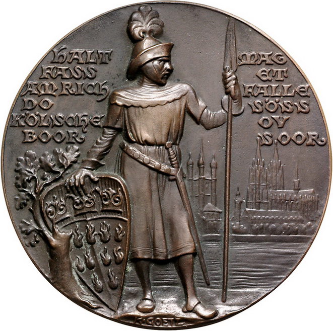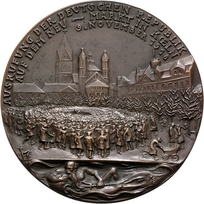 Los-Nummer: Auktion 51 - 2377 Medaillen Münchner Medailleure Goetz, Karl Bronzegussmedaille 1918. Auf die Proklamation der Republik in Köln. Mittelalterlich gekleideter Soldat mit Stadtschild vor der Ansicht der Stadt Köln / Ausrufung auf dem neuen Markt in Köln, unten ruhender Flussgott des Rheins. Kienast 275. 87 mm. Vorzüglich Schätzpreis: 400,- Zuschlag: 340,- |