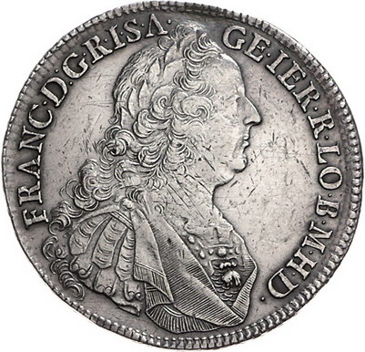 Los-Nummer: Auktion 51 - 2187 Haus Habsburg Haus Habsburg Franz I. 1745-1765, Schautaler o.J. (1753), Wien. Auf die Anwesenheit des Kaiserpaares in der neuen Münze. Brustbild Maria Theresias nach rechts / Brustbild Franz' nach rechts. Herinek - , Eypeltauer 532, Slg. Hollschek 2/1914. 21,72 g. Henkelspur, Kratzer, sehr schön Schätzpreis: 600,- Zuschlag: 1000,- |