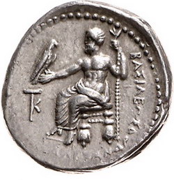 Los-Nummer: Auktion 51 - 1 Griechische Münzen Macedonia Hellenistische Dynasten Alexander III. der Große 336-323 v. Chr. Tetradrachme, Kition. 17,15 g. Kopf des Herakles im Löwenfell nach rechts / { BASELEWSALE(XANDROU)} Zeus mit Adler nach links thronend, davor Monogramm. Price 3107. Sehr schön Schätzpreis: 175,- Zuschlag: 300,- |