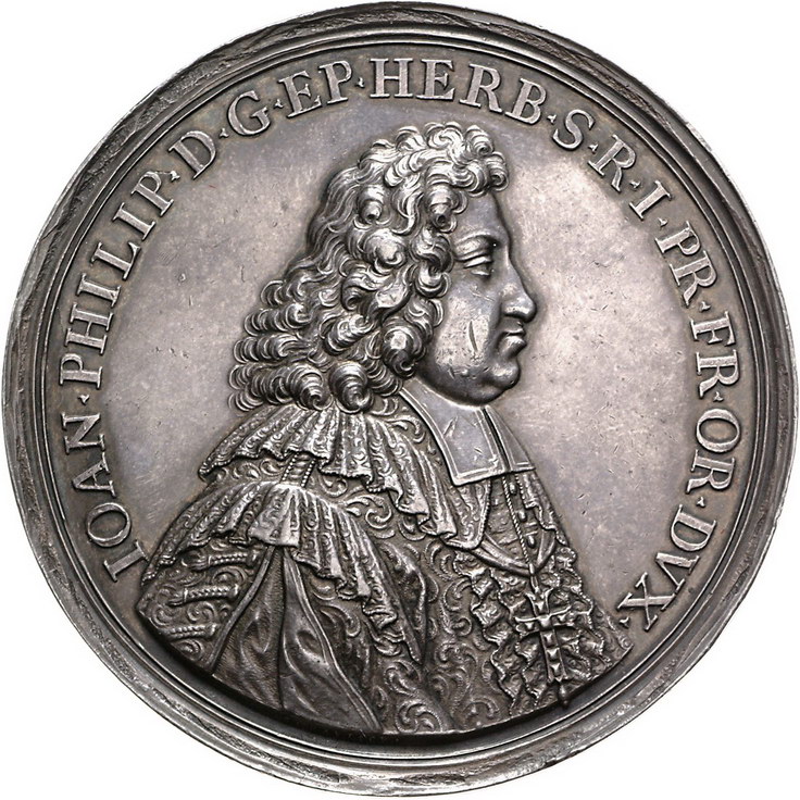 Los-Nummer: Auktion 51 - 1915 Altdeutsche Münzen und Medaillen Würzburg, Bistum Johann Philipp von Greifenklau 1699-1719, Medaillon#0Medaille# 1706, von Hautsch. Brustbild im Ornat nach rechts / Großer dreifach behelmter, von zwei Greifen gehaltener vierfeldiger Schild auf Mantel mit Fürstenhut. Helmschrott 494, Slg. Piloty 1075. 75,5 mm, 124,10 g. Schöne Patina. Leichte Randunebenheiten, vorzüglich Schätzpreis: 2500,- Zuschlag: 2850,- |