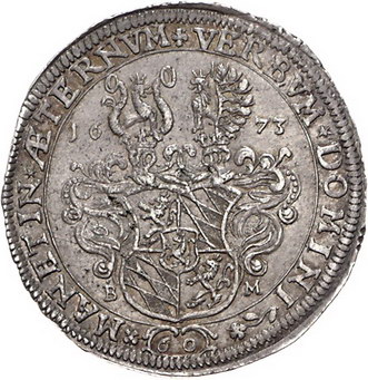 Los-Nummer: Auktion 51 - 1371 Altdeutsche Münzen und Medaillen Pfalz-Veldenz Leopold Ludwig 1634-1694, 2/3 Taler 1673, Weinburg oder Lützelstein. Geharnischtes Brustbild nach rechts, die Feldbinde reicht bis an den inneren Kreis / Unter Helmzier der gevierte Schild Pfalz-Bayern mit Veldenzer Mittelschild, oben die geteilte Jahreszahl, unten die Stempelschneidersignatur B-M (wahrscheinlich Johann Brettmacher). Noss 251, Davenport 760. Schöne Patina. Fast vorzüglich Schätzpreis: 1000,- Zuschlag: 800,- |