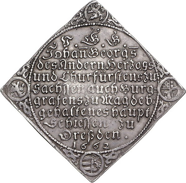 Los-Nummer: Auktion 51 - 1564 Altdeutsche Münzen und Medaillen Sachsen-Albertinische Linie Johann Georg II. 1656-1680, Talerklippe 1662. Auf das große Stahlschießen anlässlich der Vermählung seiner Tochter Erdmuthe Sophie mit Christian Ernst von Brandenburg-Bayreuth. Slg. Merseburger 1220, Schnee 914, Davenport 7631. #0var.Wappenstellung} Henkelspur, sehr schön Schätzpreis: 400,- Zuschlag: 560,- |