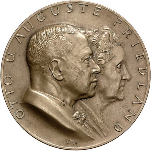 Los-Nummer: Auktion 51 - 1612 Altdeutsche Münzen und Medaillen Sachsen-Dresden, Stadt Medaillen von Friedrich Wilhelm Hörnlein, Bronzemedaille 1929. Auf die Silberne Hochzeit von Otto und Auguste Friedland. Die Büsten des Paares nebeneinander nach rechts / Blumenkorb mit Girlandenverzierung um Jubiläumsdaten. Arnold 228. Auflage in Bronze 15 Stück. Kl. Kratzer, fast vorzüglich Schätzpreis: 500,- Zuschlag: 400,- |