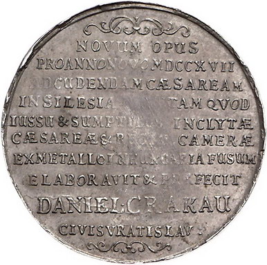 Los-Nummer: Auktion 51 - 1735 Altdeutsche Münzen und Medaillen Schlesien-Breslau, Stadt Schautalerförmige Medaille 1717. Auf die von Daniel Crakau in Breslau konstruierte Münzprägemaschine. Spindelpresse / Schrift. Fr.u.S. 4228, Slg. Strieboll 1296. 39,5 mm, 27,76 g. Schöne Patina. Prägeschwäche, sehr schön - vorzüglich Schätzpreis: 500,- Zuschlag: 400,- |