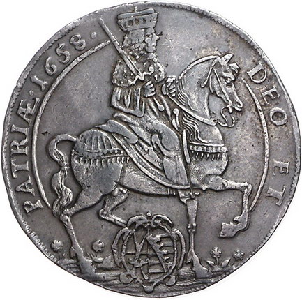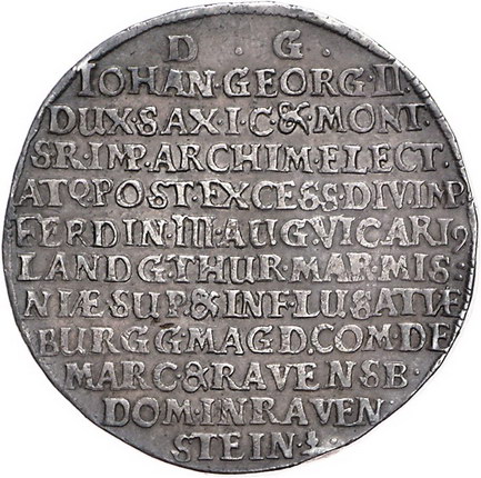 Los-Nummer: Auktion 51 - 1561 Altdeutsche Münzen und Medaillen Sachsen-Albertinische Linie Johann Georg II. 1656-1680, Dicker Doppeltaler 1658. Vikariat. Umschrift beginnt oben rechts. Nach rechts reitender Kurfürst, unten sächsischer Schild / Schrift. Clauss/Kahnt 488, Slg. Merseburger 1160, Schnee 900, Davenport 7629. Dunkle Patina. Sehr schön Schätzpreis: 2000,- Zuschlag: 2300,- |