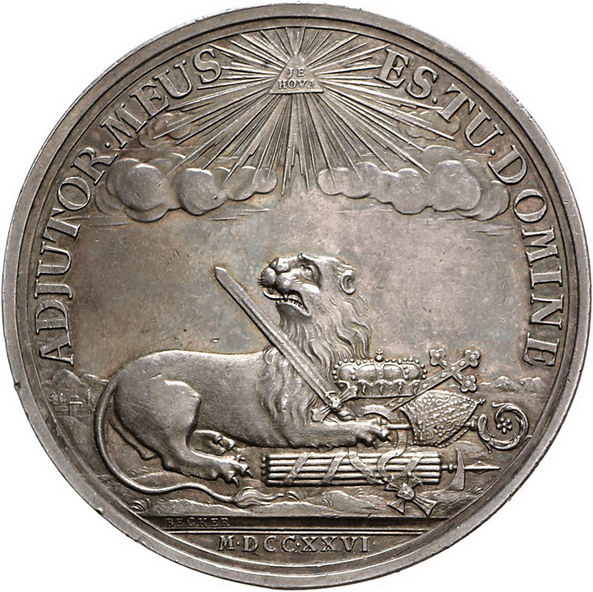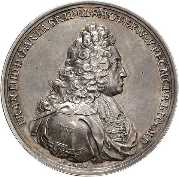 Los-Nummer: Auktion 51 - 1837 Altdeutsche Münzen und Medaillen Trier, Erzbistum Franz Ludwig, Pfalzgraf zu Neuburg 1716-1729, Medaille 1726, von Philipp Christoph Becker, Wien. Möglicherweise auf das zehnjährige Regierungsjubiläum als Erzbischof von Trier. Brustbild mit Allongeperücke im Mantel nach rechts, an der Schulter Hochmeisterkreuz / Liegender Löwe mit Schwert, vor ihm Kurhut, Kreuz, Mitra, Pedum, Fasces und Hochmeisterkreuz. Schneider/Forneck 51, Bohl 14, Exter II, 449, 170, Stemper 345, Dudik 285, Fr.u.S. 2762, Slg. Wilmersdörffer 3597, Prokisch 227. 61 mm, 73,75 g. Schöne Patina. Vorzüglich Schätzpreis: 12500,- Zuschlag: 10000,- |