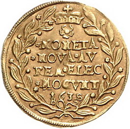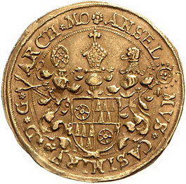 Los-Nummer: Auktion 51 - 1045 Altdeutsche Münzen und Medaillen Mainz, Erzbistum Anselm Casimir von Umstadt 1629-1647, Doppeldukat 1638. Dreifach behelmtes, vierfeldiges Wappen / Unter Kurfürstenhut und Rosette vier Zeilen Schrift, Jahreszahl und Münzmeisterinitialen. Slg. Walther 259, Friedberg 1651. GOLD. Fast vorzüglich Schätzpreis: 750,- Zuschlag: 750,- |