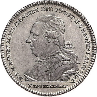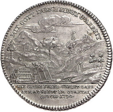 Los-Nummer: Auktion 51 - 819 Altdeutsche Münzen und Medaillen Fürstenberg Joseph Maria 1783-1796, Taler 1790, Stuttgart. Ausbeute der Grube Friedrich Christian im Schwalbachtal. Brustbild nach links / Bergwerkslandschaft mit Stollenmundloch der Grube Friedrich Christian, im Vordergrund links unter dem Zechenhaus Pochwerk und Wäsche. Dollinger 44, Davenport 2271, Berstett 312, Müseler 19/12. Vorzüglich Schätzpreis: 1500,- Zuschlag: 1400,- |