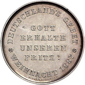 Los-Nummer: Auktion 51 - 575 Altdeutsche Münzen und Medaillen Brandenburg-Preußen Friedrich III. 1888, Weihnachtsmedaille 1887, von Weigand. Büste nach rechts / GOTT ERHALTE UNSEREN FRITZ. Slg. Marienburg 6553. 30,5 mm, 13,31 g. Vorzüglich Schätzpreis: 100,- Zuschlag: unverkauft |