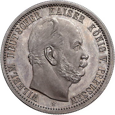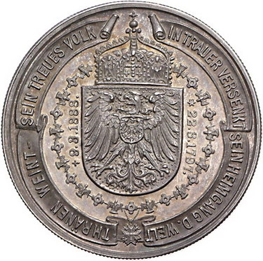 Los-Nummer: Auktion 51 - 572 Altdeutsche Münzen und Medaillen Brandenburg-Preußen Wilhelm I. 1861-1888, Medaille 1888 in 5-Mark Größe. Auf seinen Tod. Büste nach rechts / Gekrönter Adlerschild mit Ordenskette und Schriftband. Slg. Marienburg 6298. 38,5 mm, 27,38 g. Schöne Patina. Polierte Platte. Fast Stempelglanz Schätzpreis: 250,- Zuschlag: 380,- |