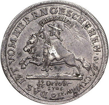 Los-Nummer: Auktion 51 - 1405 Altdeutsche Münzen und Medaillen Pommern-unter schwedischer Besetzung Karl XII. 1697-1718, Guldenförmige Medaille 1706, von Johann Memmius, Stettin. Auf den zu Altranstädt geschlossenen Frieden zwischen Schweden, Polen und Sachsen. Brustbild Karls XII. mit Harnisch und Perücke nach rechts / Nach links reitender Postillon mit Friedensfahne. Slg. Pogge -, Slg. Bratring 687. Daßdorf vergl. 1141, Hildebrand 100. 38 mm, 20,71 g. Sehr schön Schätzpreis: 300,- Zuschlag: 240,- |