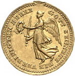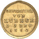 Los-Nummer: Auktion 51 - 536 Altdeutsche Münzen und Medaillen Brandenburg-Preußen Friedrich Wilhelm III. 1797-1840, Kleine Goldmedaille, so genannter Siegespfennig 1813. Auf den Sieg gegen Napoleon und die Einnahme der Stadt Lübeck. Viktoria / Schrift. Sommer A 165/24, Bramsen 1288, Röhl 110.02 (Ag, Fe), Behrens 742 (Ag). 15 mm, 1,85 g. GOLD. Äußerst selten. Entfernter Henkel, fast vorzüglich Schätzpreis: 750,- Zuschlag: unverkauft |